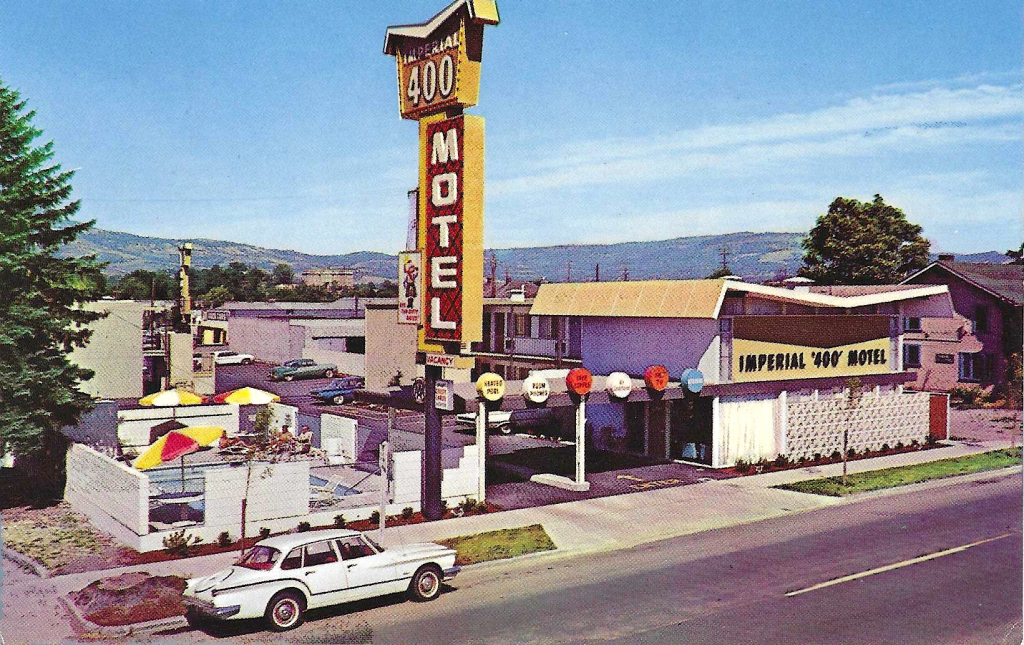 The note on the back of my Imperial “400” Motel postcard speaks to the psychology of the times (May 1965), when even a small trip away from home was worthy of a short “thinking of you” postcard. It was sent to Eureka, CA from Medford, OR and says simply, “Hello, Everybody – Having Fun – Jim”.
